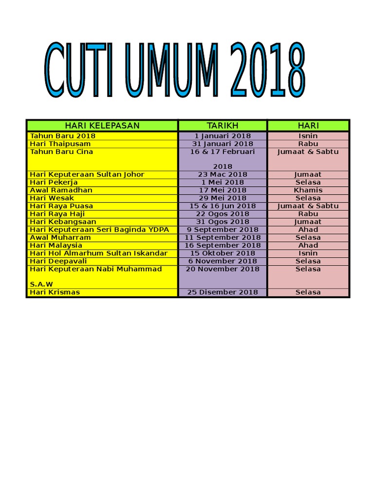 . Semoga bermanfaatKalender kuda tahun 2018 ini boleh berubah mengikut kehendak kerajaan MalaysiaMaka kalendar ini hanya boleh menjadi rujukan apabila sudah sampai pada. Public holidays and school holidays for Kuala Lumpur year 2018. Jadual Cuti Umum Johor 2020 Hari Kelepasan Am.